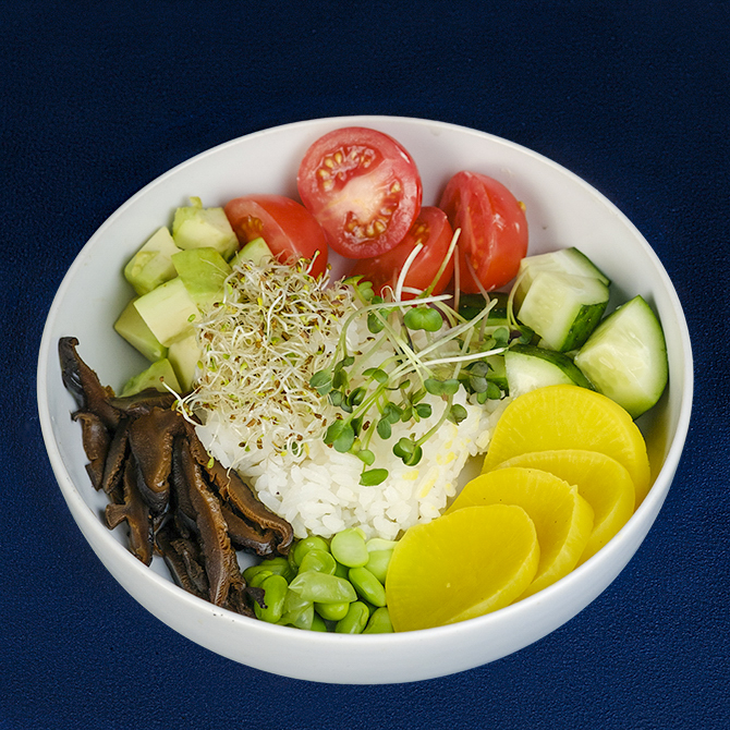 Рис, помідорм чері, гриби шиїтаке, боби едамаме, авокадо, свіжий огірок, такуан, соус для болів