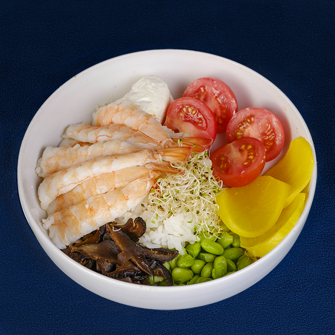 Рис, помідор чері, гриби шіїтаке, такуан, боби Едамаме, тигрова креветка, мікрогрін люцерна, крем соус, трюфельний соус