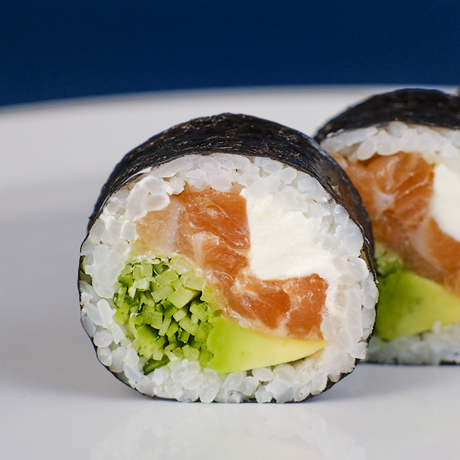 Рис, норі, лосось, устричний соус, авокадо, огірок, сир, 8 шматочків