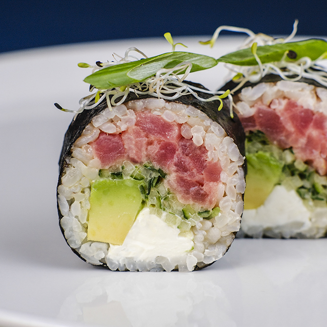 Рис, норі, тунець, устричний соус, авокадо, огірок, сир, зелена цибуля, 8 шматочків
