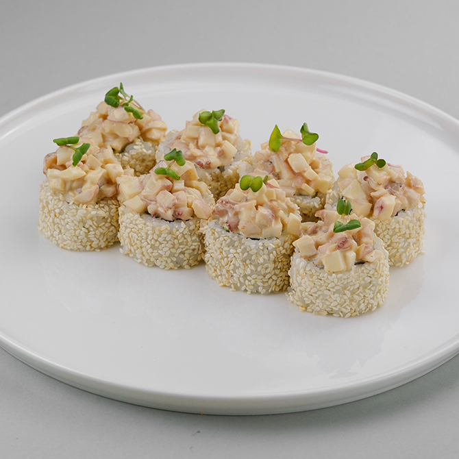 Рис, норі, кальмар, устричний соус, сир, огірок, авокадо, омлет Томаго, білий кунжут, 8 шматочків