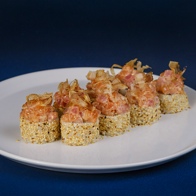 Рис, норі, огірок, авокадо, крем-сир, омлет Томаго, лосось, тунець, устричний соус, білий кунжут, стружка тунця, 8 шматочків