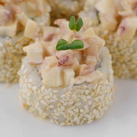 Рис, норі, кальмар, устричний соус, сир, огірок, авокадо, омлет Томаго, білий кунжут, 8 шматочків