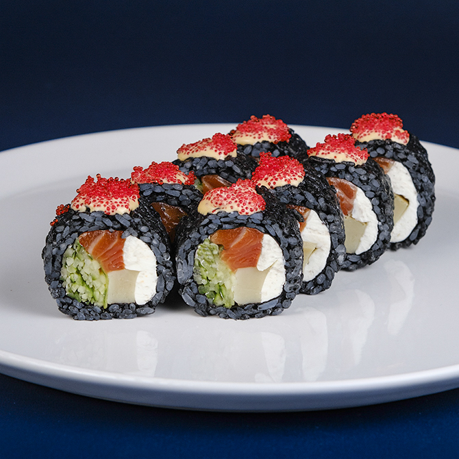 Лосось с\с, омлет томаго, ікра тобіко, свіжий огірок, чорнило каракатиці, рис, норі, соус спайс, крем сир Cremette, 8 шматочків