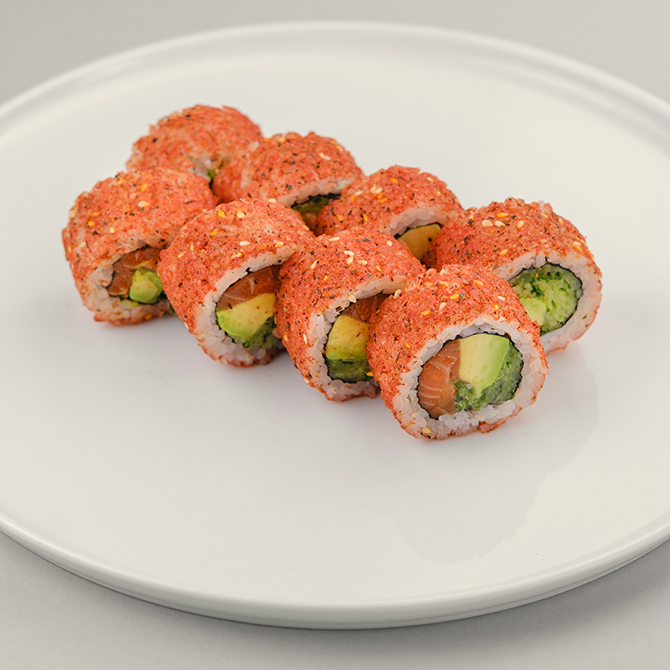 Рис, норі, лосось, огірок, авокадо, фурікаке, устричний соус, майонез, 8 шматочків