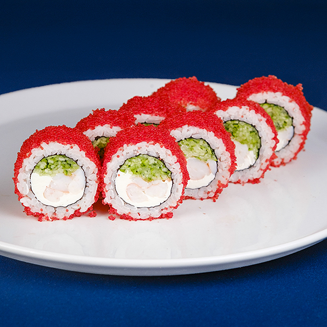Рис, Ікра тобіко, Огірок, Креветка, Крем сир, Норі