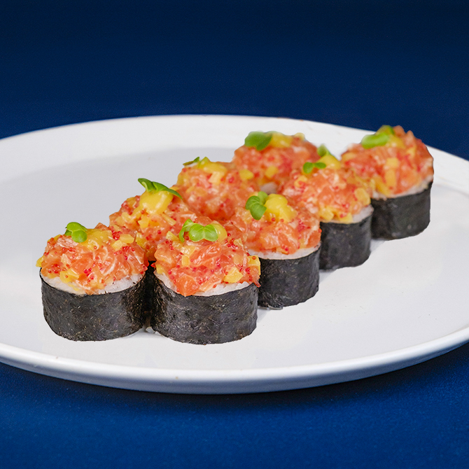 Рис, норі, сир Філадельфя, омлет томаго, огірок, лосось, манговий соус, ікра тобіка, редька такуан, мікрогрін редис, 8 шматочків