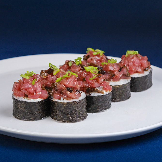 Зелена цибуля, рис, норі, сир Філадельфія, омлет томаго, огірок, тунець, гриби шиітакі, соус унагі, кунжутна олія, 8 шматочків