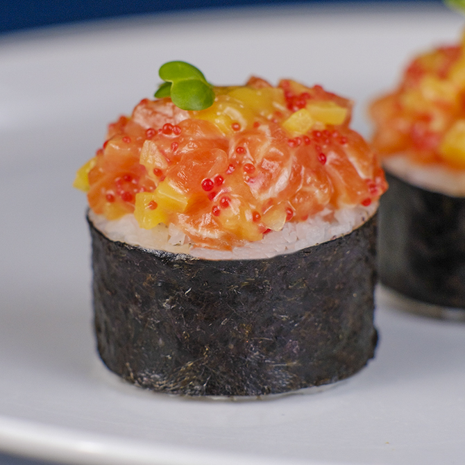 Рис, норі, сир Філадельфя, омлет томаго, огірок, лосось, манговий соус, ікра тобіка, редька такуан, мікрогрін редис, 8 шматочків