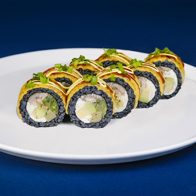 Вугор, омлет томаго, крем сир Cremette, авокадо хас, огірок, чорнило каракатиці, сир чеддер, соус чеддер, соус унагі, зелена цибуля, рис, норі, 8 шматочків.