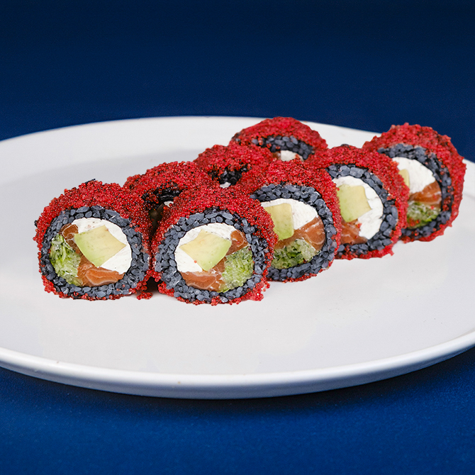 Лосось с/с, крем сир Cremette, ікра тобіко, авокадо хас, огірок свіжий, чорнило каракатиці, 8 шматочків.
