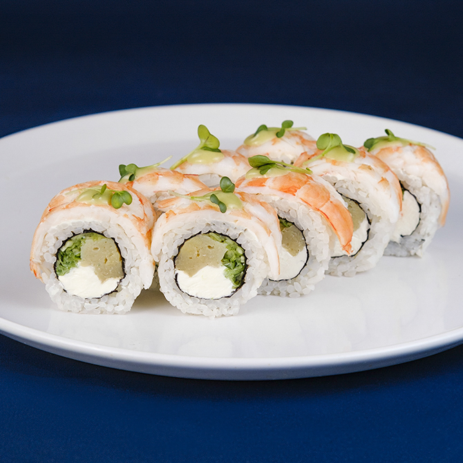 Рис, норі, крем сир Cremette, огірок свіжий, омлет томаго, тигрова креветка, соус васабі ( містить лактозу