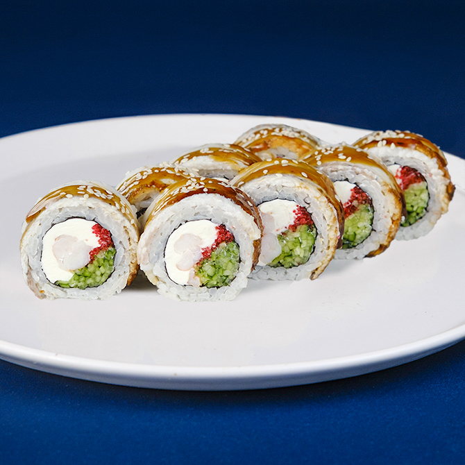 Вугор, крем сир Cremette, ікра тобіко, свіжий огірок, креветка Тигрова, соус унагі, кунжут, 8 шматочків