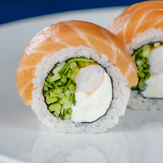 Лосось с\с, Креветка, Крем сир, Огірок, Норі, Рис