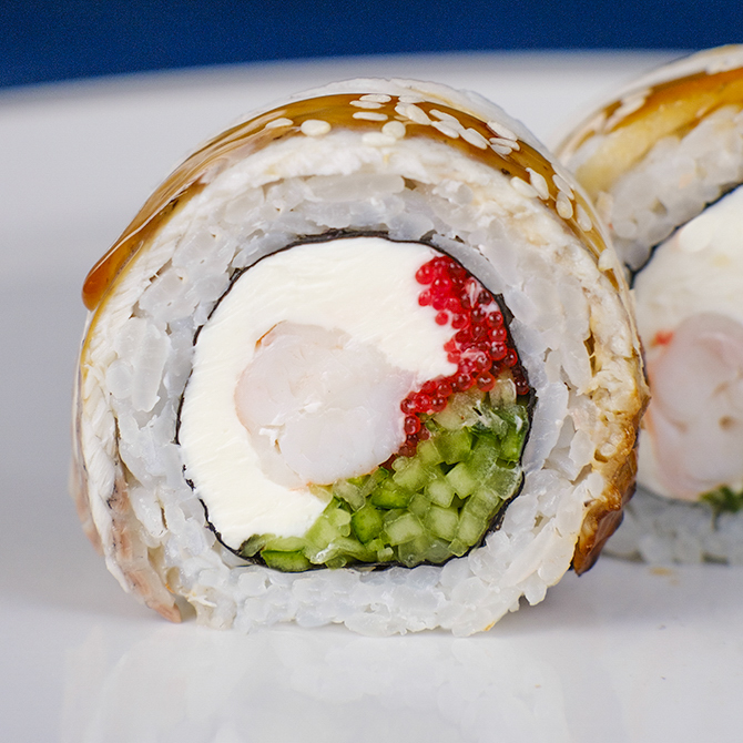 Вугор, Креветка, Рис, Ікра тобіко, Огірок, Соус унагі, Норі, Кунжут