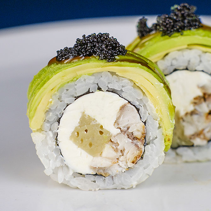Авокадо хас, вугор, омлет томаго, ікра тобіко, крем сир Cremette, соус унагі, 8 шматочків.