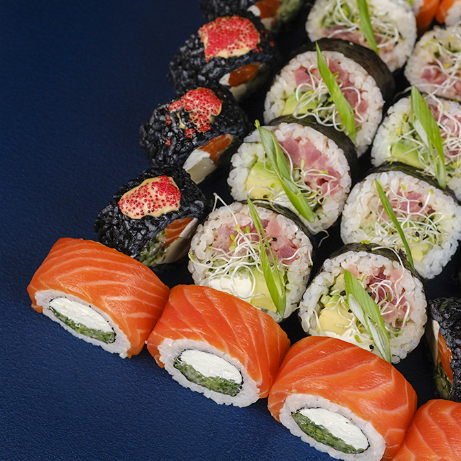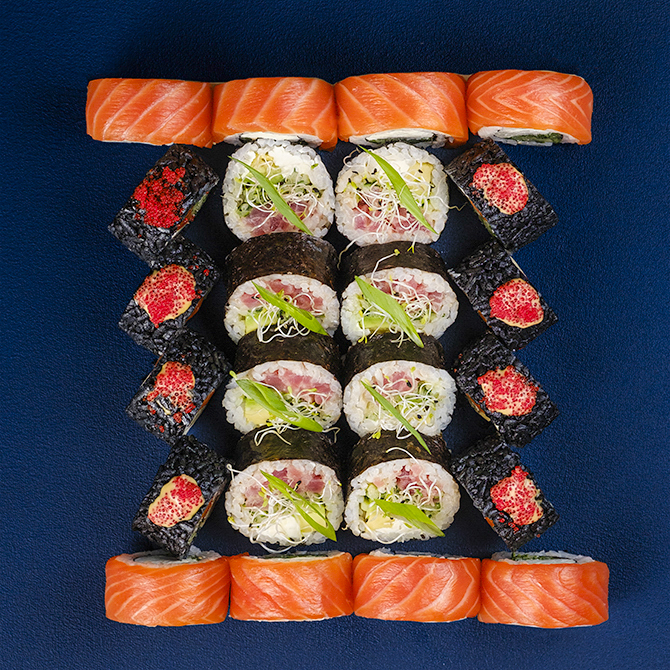 Філадельфія у лососі, Фірмовий , Футо з тартаром тунця Алергени: глютен, соя, лактоза, яйця, кунжут, молюски