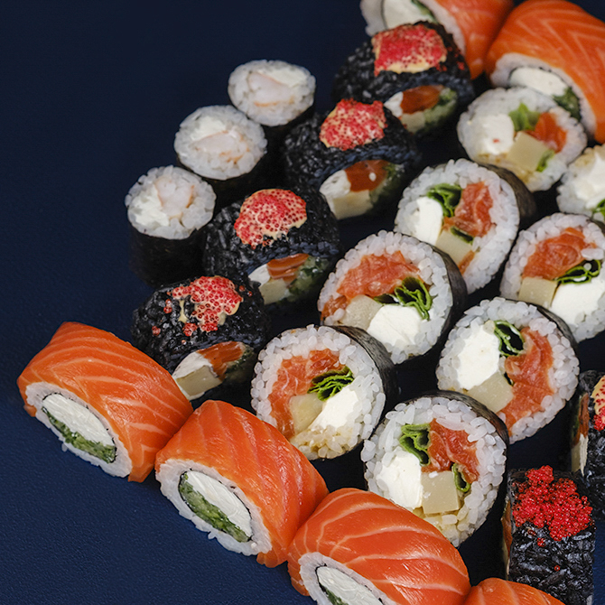 Саторі, Фірмовий рол, Філадельфія в лососі, Макі з креветкою та сиром