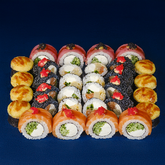 Лосось с\с, Тунець, Омлет томаго, Сніговий краб, Сир гауда, Крем сир, Рис, Норі