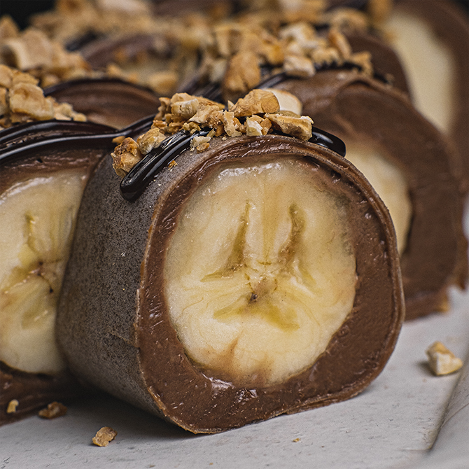 Банан, рисове тісто, паста Нутелла, крем сир Cremette, горіхи, топінг, 8 шматочків