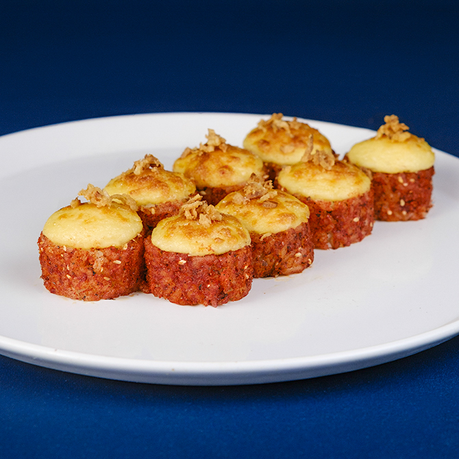 Рис, норі, копчений сир Cremette, шрірача, лосось, тунець, омлет Томаго, фурікаке, сир Гауда, японський майонез, смажена цибуля, 8 шматочків